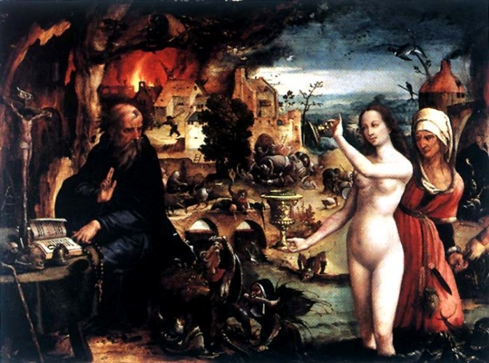 San Antonio nació en el año 215 de nuestra era en Heracleópilis Magna (Egipto) y fue uno de los primeros anacoretas del desierto. Dice la tradición que en su vida contemplativa cuidaba de los animales que a él se acercaban y éstos a su vez, lo protegían de las alimañas; también se dice que en su solitaria existencia era frecuentemente tentado de diversas maneras por el maligno, al cual se resistía y de ahí, posiblemente venga el hecho de que en nuestras fiestas siempre anden los dimonis a su alrededor, siendo un recurrente en la iconografía artística de la cultura occidental, como en este cuadro flamenco de Coecke Van Aelst.