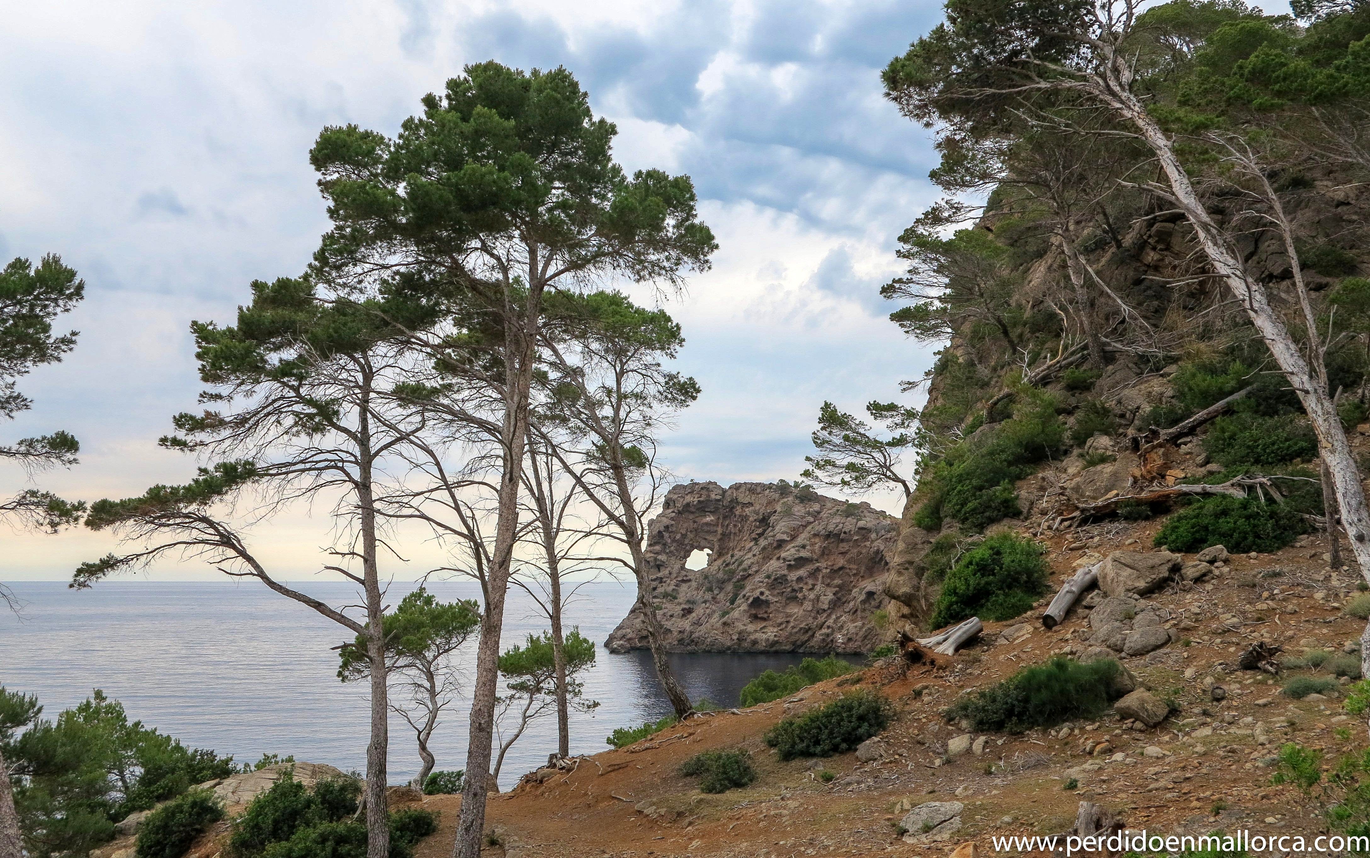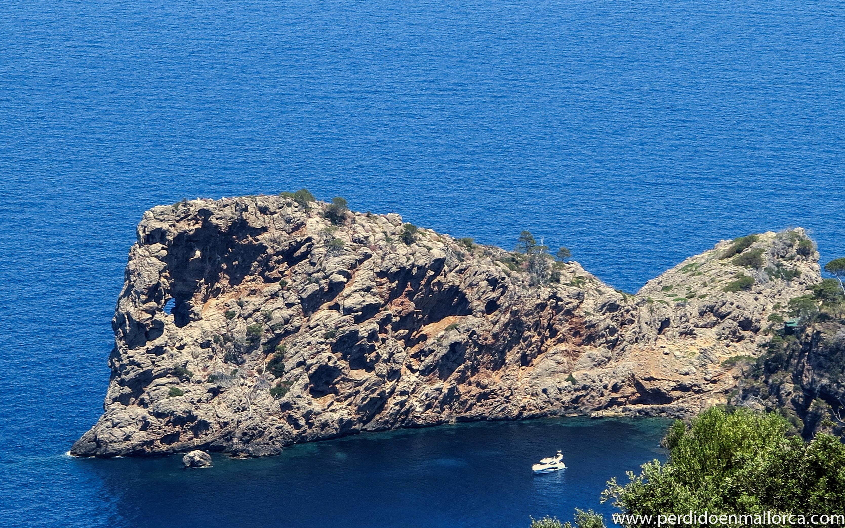 La altura del promontorio es de 84 m sobre el nivel del mar y su óculo mide 16 m de diámetro, la costa en la zona es acantilada, compuesta por enormes bloques de derrubio que llegan al mar. Me sorprendió encontrar, sobre una elevación con vista directa de Sa Foradada, un rústico restaurante, que funciona en temporada veraniega para los afortunados que se acercan en barco o, para los atrevidos que lo hacen a pié. Según me contaron los lugareños, preparan buenas paellas que, degustadas en su terraza y ante un panorama tan magnífico, deben de saber a gloria.