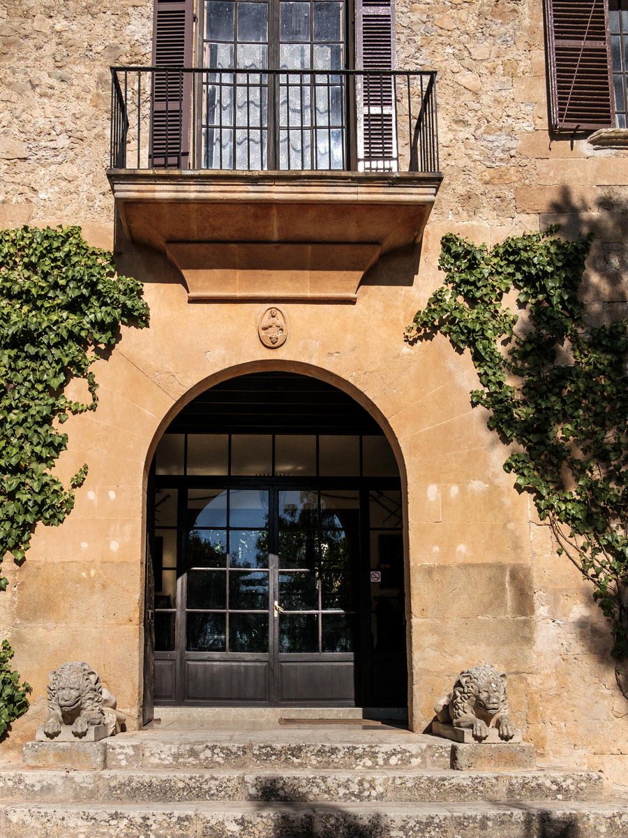 Puerta de acceso principal elevada sobre seis escalones, con arco de medio en cuya clave se encuentra un medallón con el Corazón de Jesús y un serafín. El umbral de la puerta está flanqueado por leones yacentes.