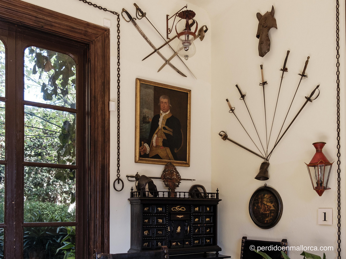 Sala con retrato de Joan Manuel de Sentmenat (1688-1755) y panoplias con espadas, sables y floretes; debajo del retrato hay un cofre con objetos pertenecientes al capitán Antoni Barceló y Pont de la Terra «Capitá Toni» del que ya he hablado en este blog.