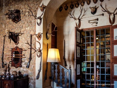 Sala de caza con trofeos, escopetas, cuernas y algunas antiguas granadas de cañón. La reja da paso a la biblioteca y sala de estudio de la casa.
