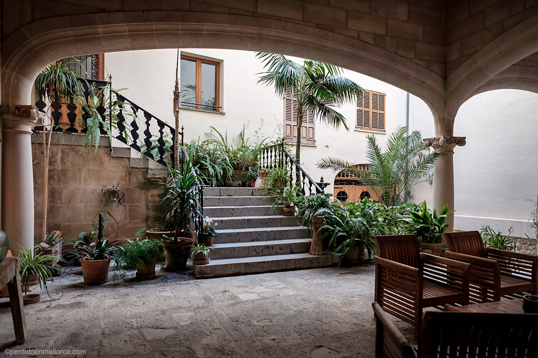 Galería cubierta con arcos carpaneles sobre columnas de fuste liso abombado y patio de acceso a una vivienda.
