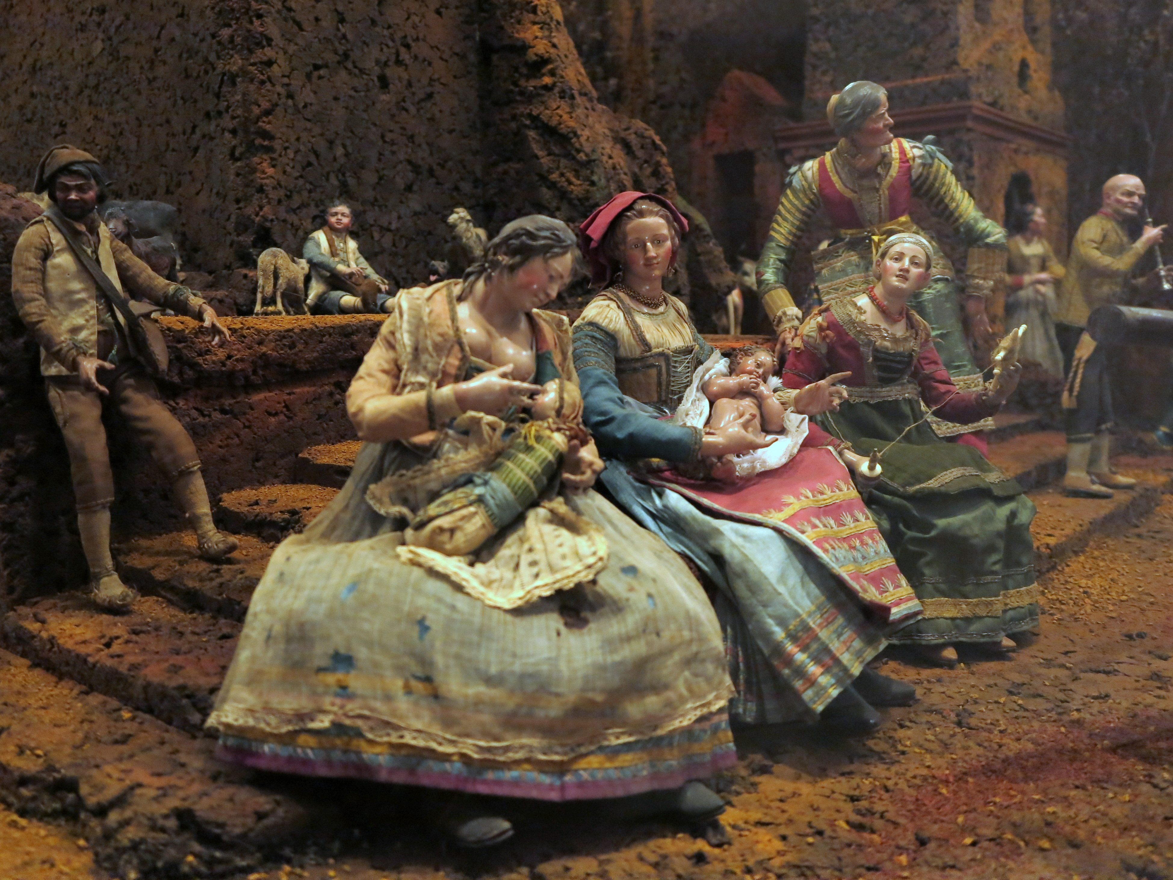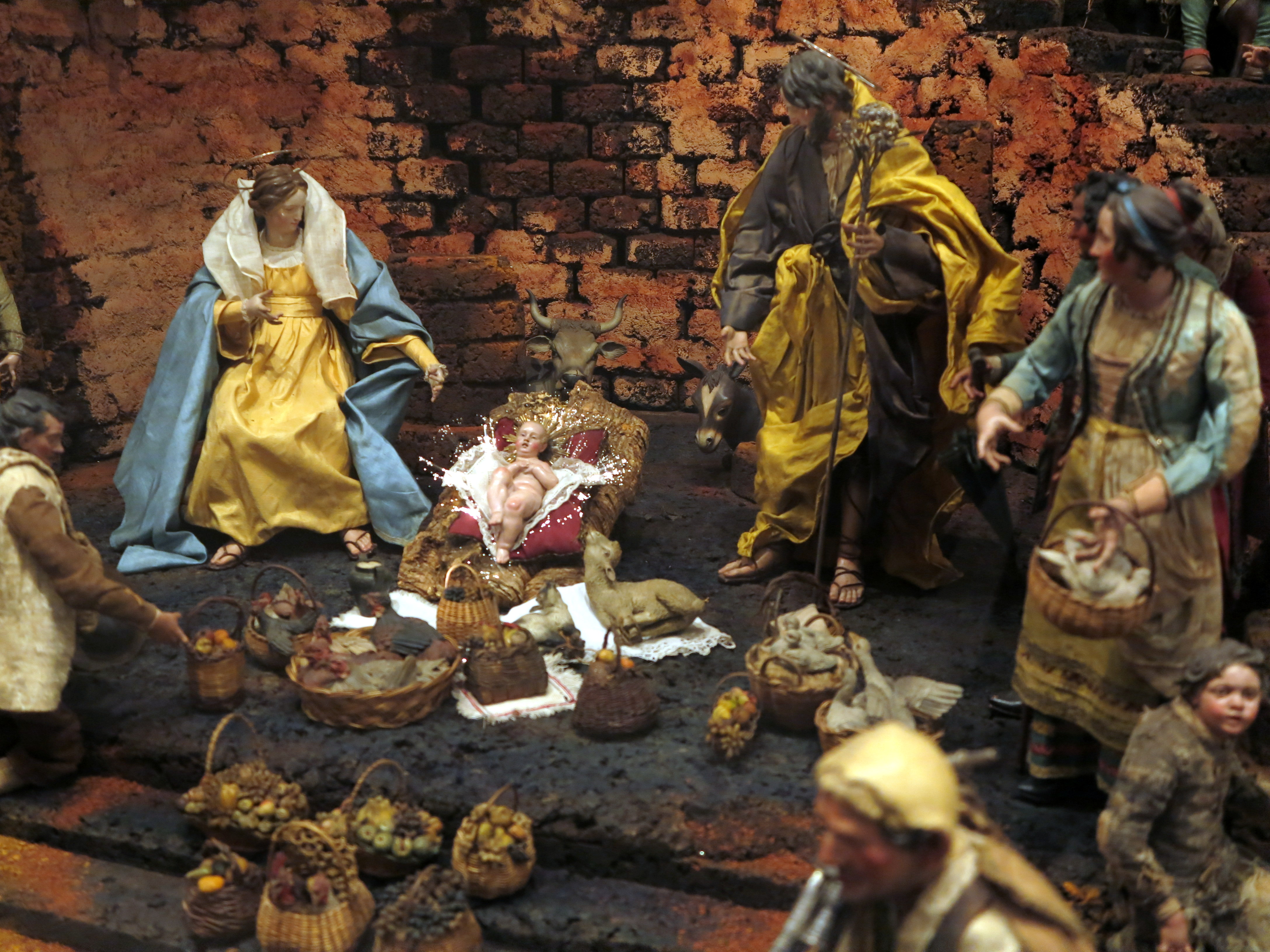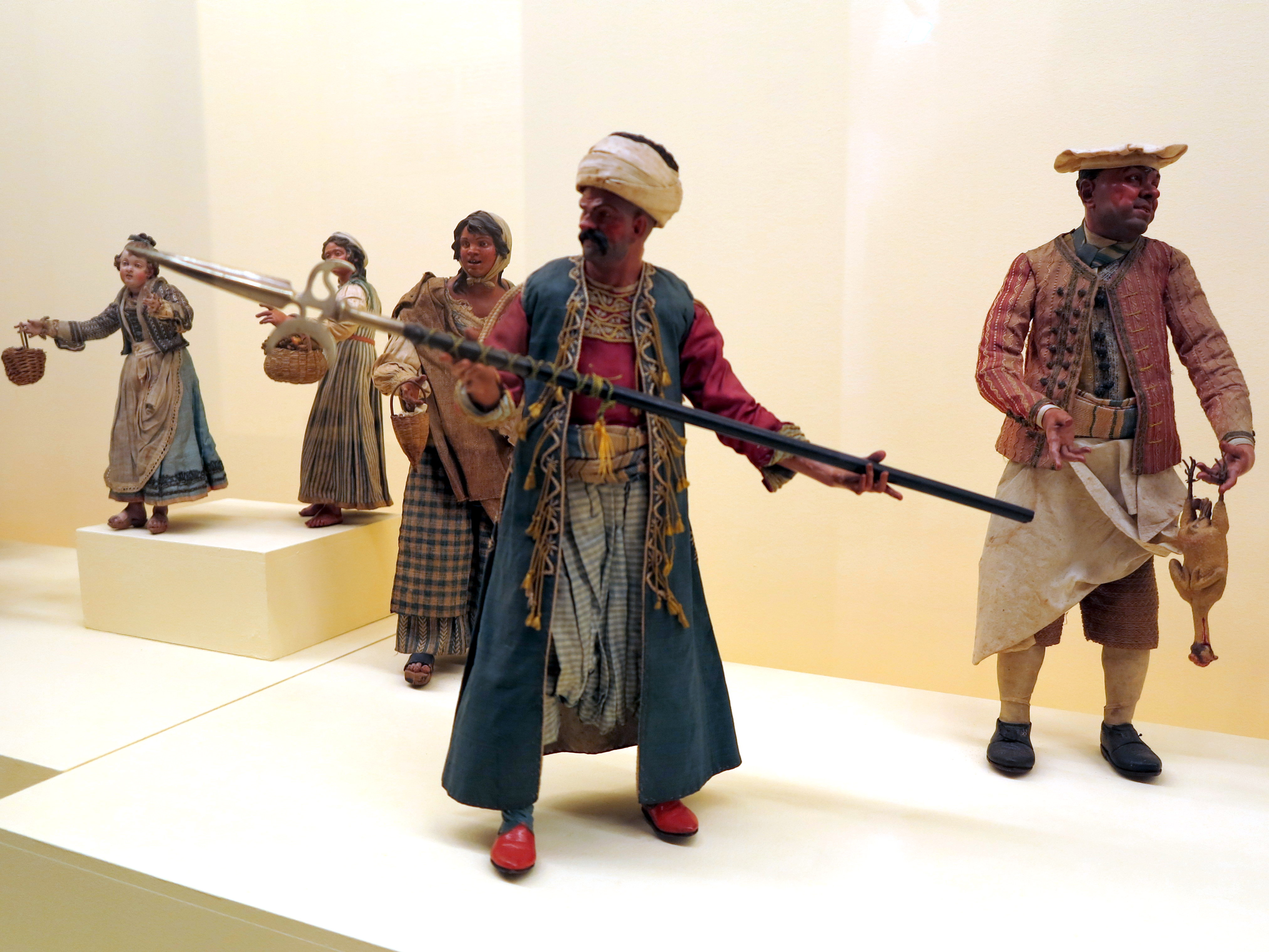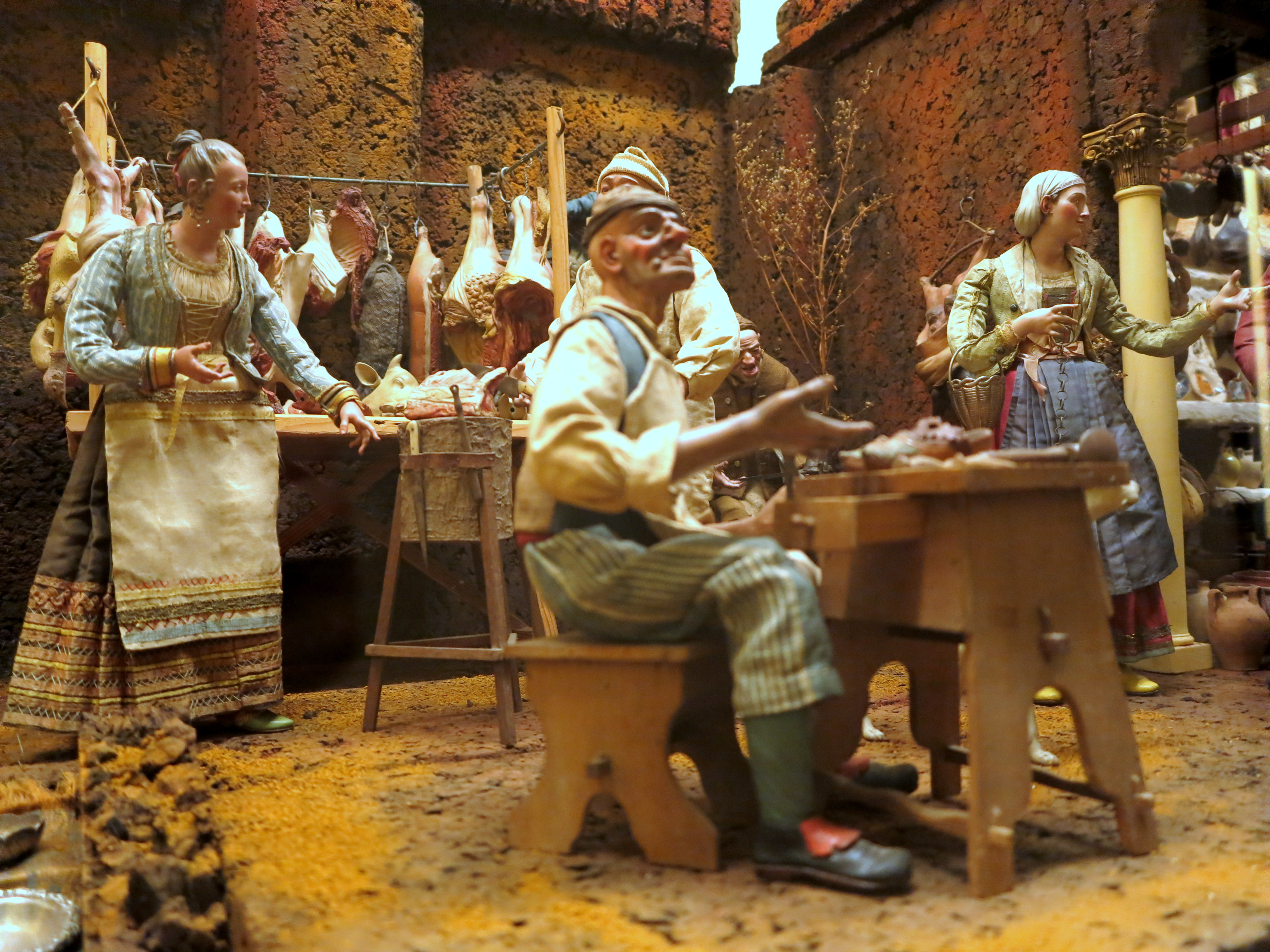 Las figuras son realistas y hechas a mano, representan tipos napolitanos dieciochescos en su indumentaria y también, otros personajes de regiones alejadas que acuden a adorar al Niño. Se construían y aún se sigue haciendo así, con la cara, los brazos y las piernas de arcilla cocida casi vitrificada, bellamente policromadas y con los ojos de cristal. El cuerpo se hace con estopa y alambre para que admita movimiento y que se le pueda cambiar de postura a voluntad. La vestimenta de las figuras es muy elaborada, siendo la de la Madonna (la Virgen) y los Ángeles de rico tafetán de seda y, la de los pastores de lana o algodón. El tipismo napolitano está presente en todas las representaciones y, aún hoy día, sigue manteniéndose inalterada esta tradición que no cambia con las modas.