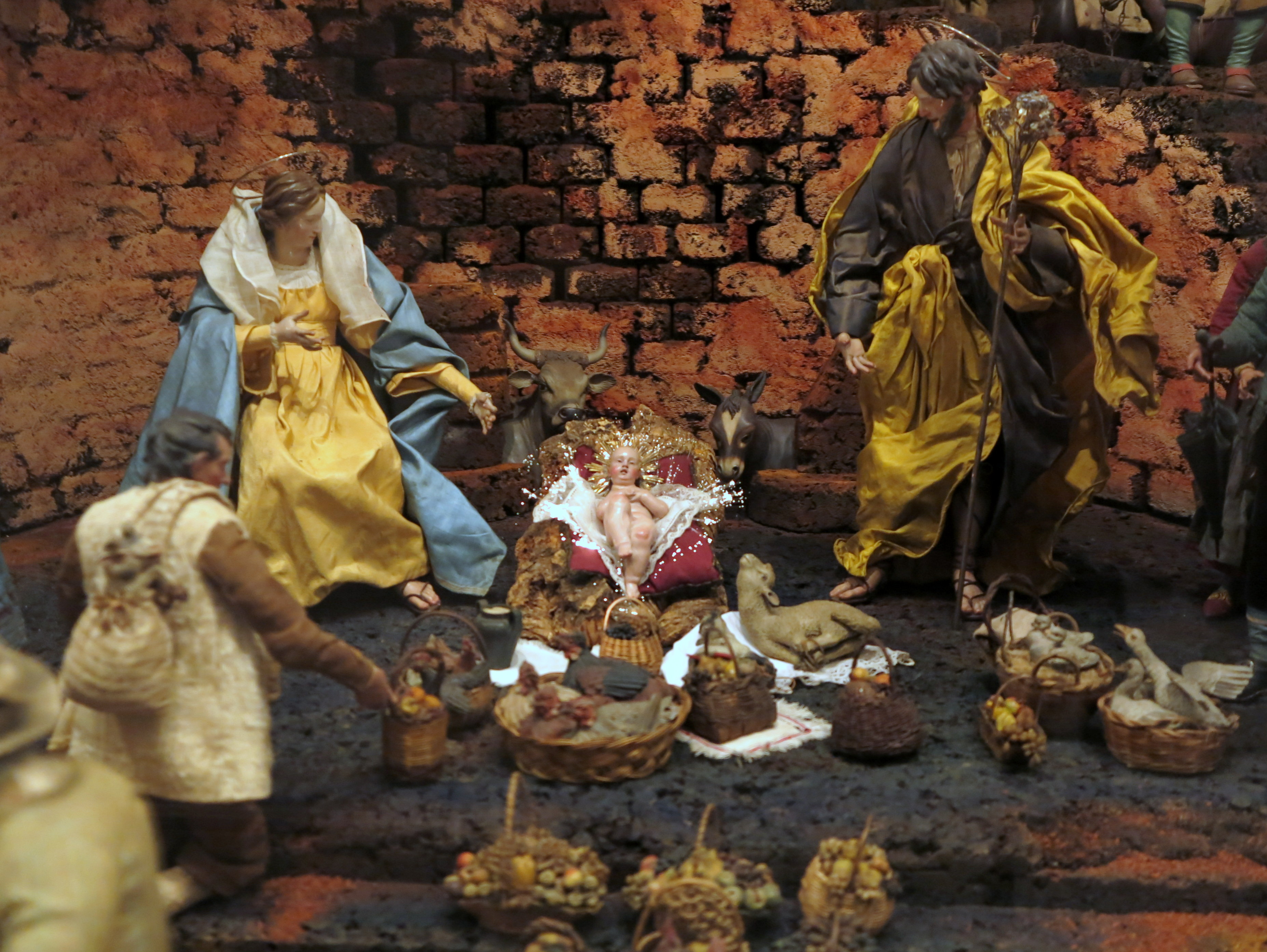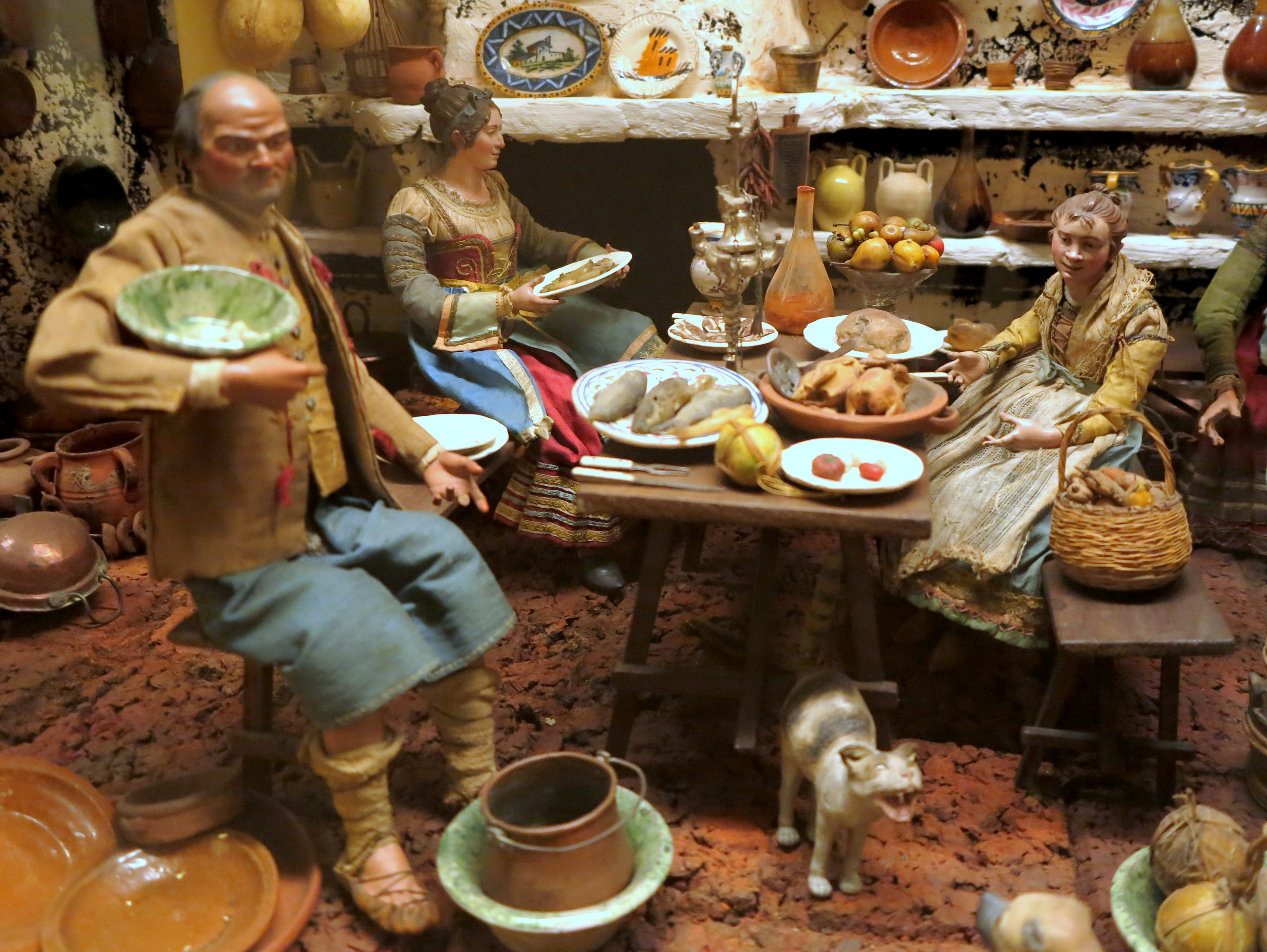 El primer Belén Napolitano con figuras de barro data del siglo XV y en sus comienzos, las imágenes eran de gran tamaño y tan solo se colocaban en iglesias o residencias de personas principales. Hasta el siglo XIX los Nacimientos con figuras no se popularizaron, adoptándose entonces la costumbre de montarlos en el lugar preeminente de las casas familiares, pasando a convertirse en el centro de las celebraciones navideñas y el sitio en el que se cantaban villancicos acompañados de panderetas, zambombas, guitarras y otros instrumentos populares.