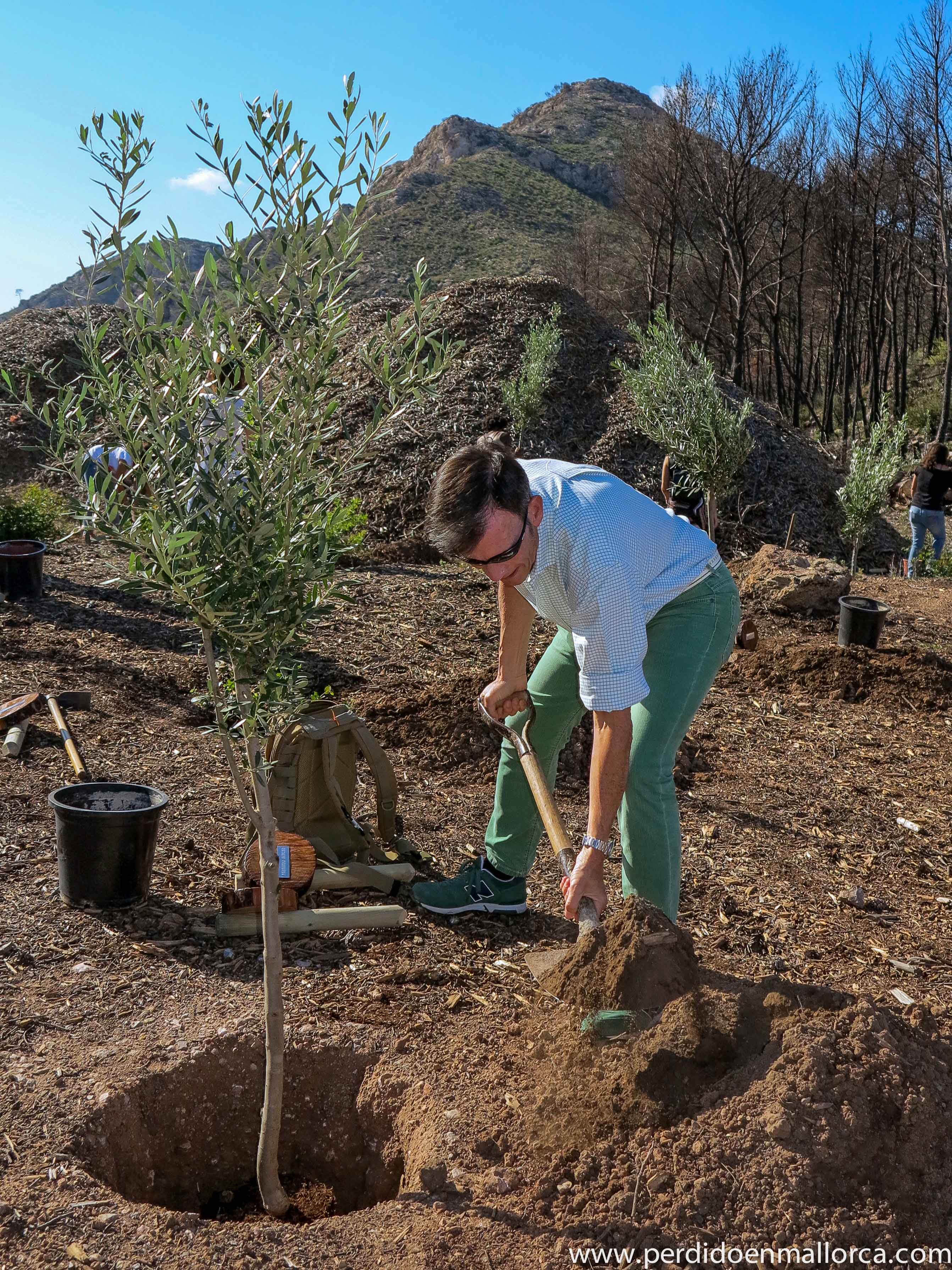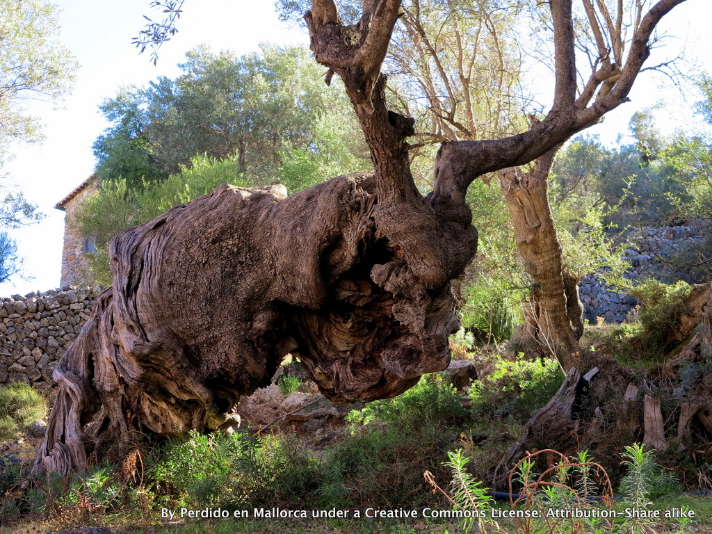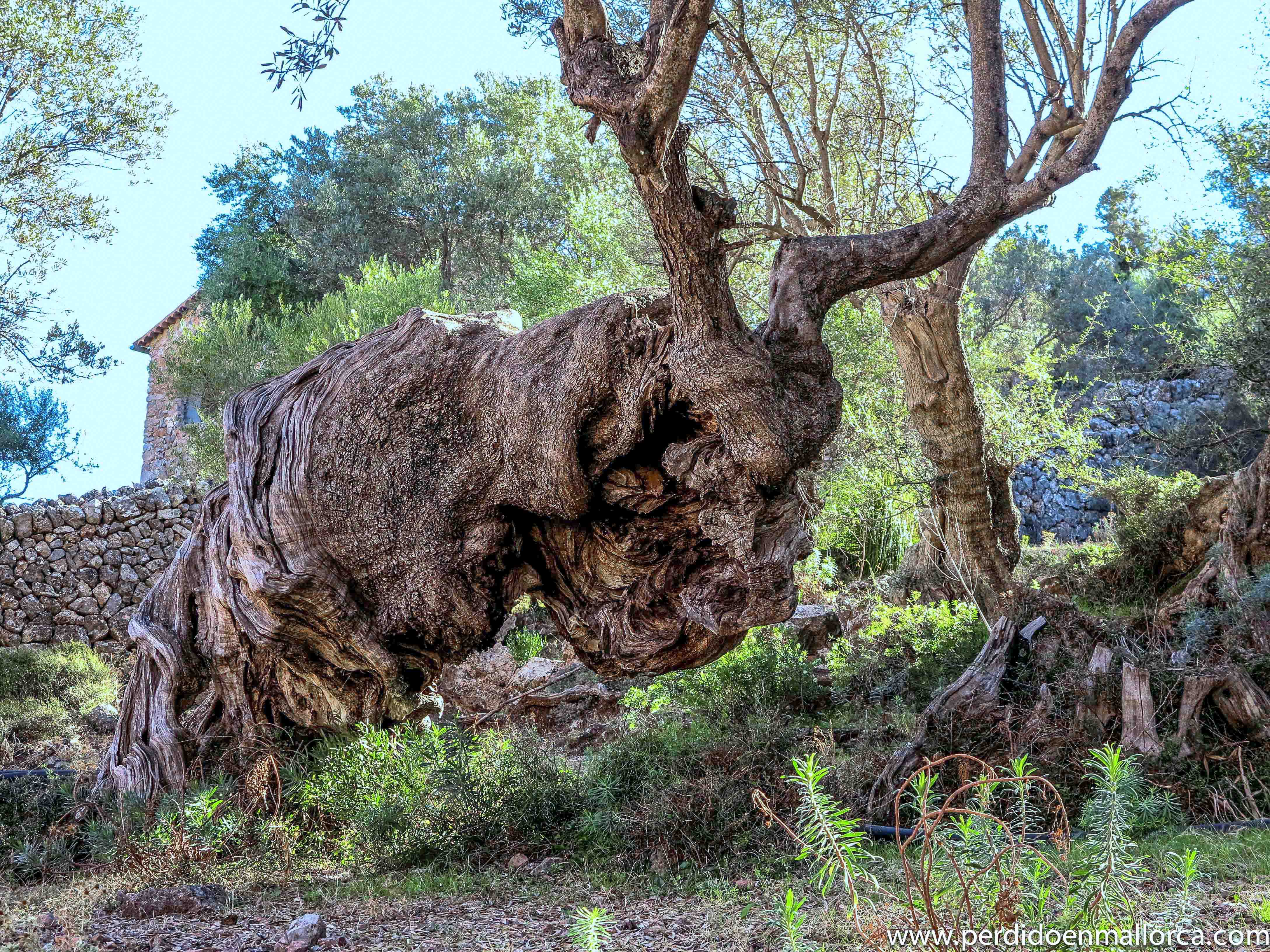 Olivera (olivo) en la Serra de Tramuntana, cerca de Fornalutx, al fondo de la imagen se aprecia de forma parcial el pueblo de Sóller.